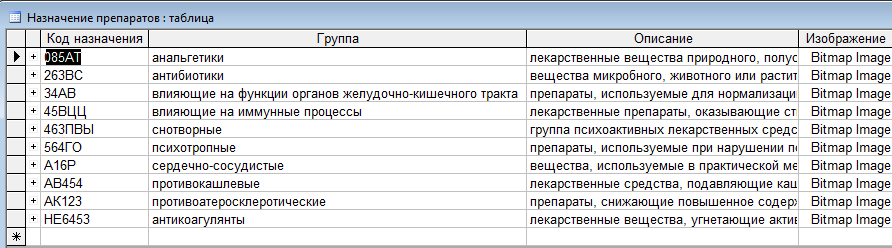Подсистема Назначения дает характеристику препаратов, определяет их группу принадлежности. Отдельная группа предназначена для больных с определенным заболеванием какого-то органа или организма в целом. Каждой группе присваивается уникальный код (первичный ключ). В этой подсистеме дается полное описание групп препаратов, их действие и то, как может выглядеть препарат данной группы.