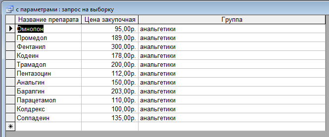 3) Запросы с параметрами. Отличие запросов с параметрами заключается в способе управления условиями: вместо ввода фактических значений настраивается приглашение пользователю ввести значения условий при запуске запроса. При выполнении такого запроса выдается диалоговое окно "Введите значение параметра" (Enter Parameter Value), в котором пользователь должен ввести конкретное значение и затем получить нужный результат. Ввести группу препарата. Пользователь вводит нужную ему группу препарата, например, анальгетики.