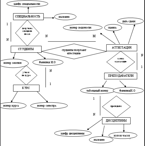 В направлении СТУДЕНТЫ получают АТТЕСТАЦИЯ устанавливаем связь N:M так, как один студент может получает много аттестаций по разным дисциплинам; и много студентов получают одну аттестацию по одой дисциплине.