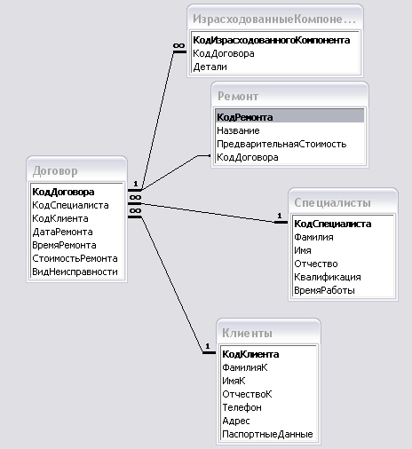 В любой коммерческой организации необходимо хранить подробную информацию о клиентах. При заключении договора регистрируются данные о виде неисправности, стоимости ремонта, запчастях необходимых для ремонта, даты, и времени необходимого для ремонта. Так же существуют данные, в которых отображается полная информация о запчастях необходимых для ремонта. Можно вводить данные о новых специалистах, и стоимость составляющих.