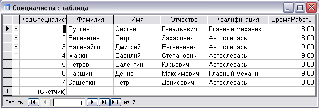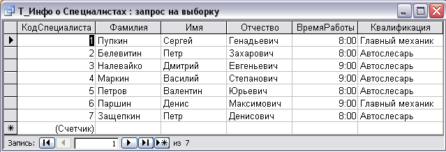 Из рисунка видно, что в таблице содержится только информация о главных механиках, что и было необходимо. Фильтрацию можно провести по любой квалификации. Также в данной форме можно добавлять новых поступивших на работу специалистов, и вносить все необходимые данные о них.