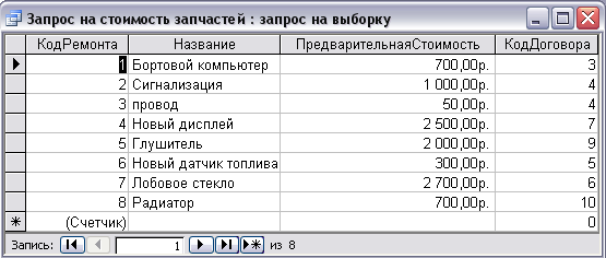Выполним запрос на Информацию о стоимости запчастей (рисунок 12):