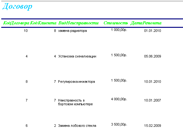 Когда заключается договор, указывается дата ремонта, вид неисправности, стоимость ремонта