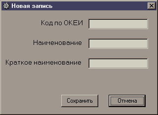 В данном справочнике мы видим информацию о единицах измерения и имеем возможность выполнять различные операции с записями рассматриваемого справочника по нажатию кнопок. При нажатии кнопки «добавить» происходит добавление информации в справочник, по средством следующей формы.