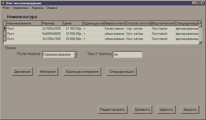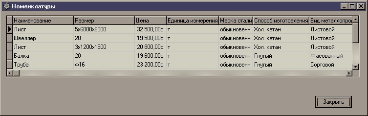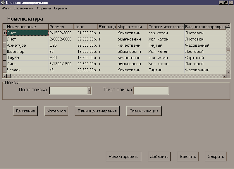 В данном справочнике отражается вся информация о свойствах, характеристиках металлопродукции в виде полей таблицы. Вверху окна расположена командная строка с выпадающим меню, по которому мы можем перемещаться по интересующим нас справочникам, по движению номенклатуры, а также посмотреть справку.