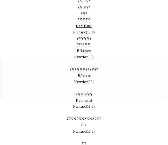 Банк мы решили выделить в качестве сущности, так как банки часто у различных контрагентов одни и те же, и поэтому отпадает необходимость по несколько раз вводить одно и то же. К тому же существуют классификаторы банков Российской Федерации, в которых указаны все их реквизиты: БИК, корр-счет, адрес, наименование. И их при необходимости можно просто загрузить. Все эти реквизиты выступают в роли атрибутов в сущности банк.