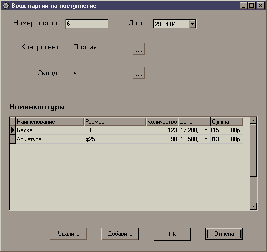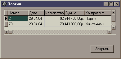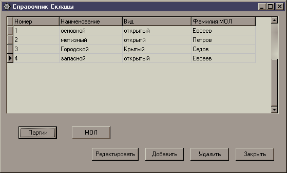 При нажатии кнопки «Партии» мы получаем партии, которые хранятся на данном складе. Связь между данными таблицами осуществляется при вводе партии. На экран выводится таблица, которая содержит элементы таблицы «Партии», связанные с соответствующим элементом таблицы «Склад»
