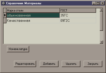 Справочник «Материалы» содержит сведения о материалах, из которых изготовлена продукция. Окно данного справочника довольно небольшое, это обусловлено малым количеством информации, которую он в себя включает Он представлен на рисунке 3.