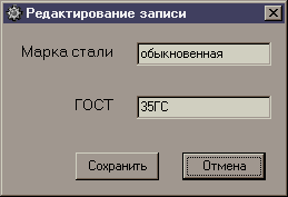 По кнопке «редактировать» происходит редактирование текущей записи. Форма та же, что и при создании нового элемента справочника, вызываемой по кнопке «добавить», только поля заполнены соответствующими данными.