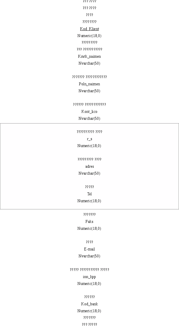 KLIENT (Kod_Klient, Kratk_naimen, Poln_naimen, Kont_lico, r_s, adres, Tel, Faks, E-mail, inn_kpp, Kod_bank)