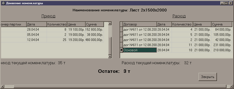 В справочнике «Номенклатура» предусмотрены кнопки с названиями различных справочников. Они дают возможность получить более подробную, чем а таблице, информацию о различных характеристиках связанных с данным элементов других справочников. Так, по кнопке движение мы получаем две таблицы, в которых отражен приход и расход соответственно данной позиции номенклатуры. Также показан итоговый приход, расход и остаток в единицах измерения данной позиции номенклатуры.