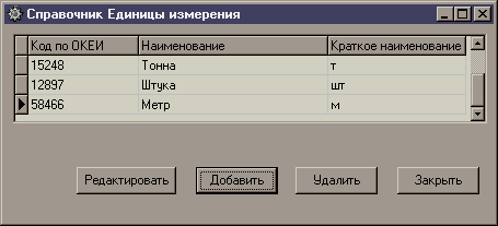 При выборе в подменю справочника «Единица измерения» мы получаем следующую форму.