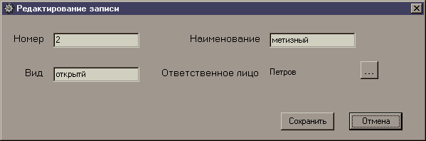 При редактировании записей таблицы появляется та же форма, что и при вводе, но уже с заполненными полями. Для этого считывается текущий номер заявки, на котором стоит курсор. Далее создается запрос к соответствующей таблице, из которой извлекаются все необходимые данные. Таким образом происходит заполнение полей. После редактирования записей при нажатии кнопки OK происходит обновление соответствующих полей в таблице. Данная операция описана ниже.