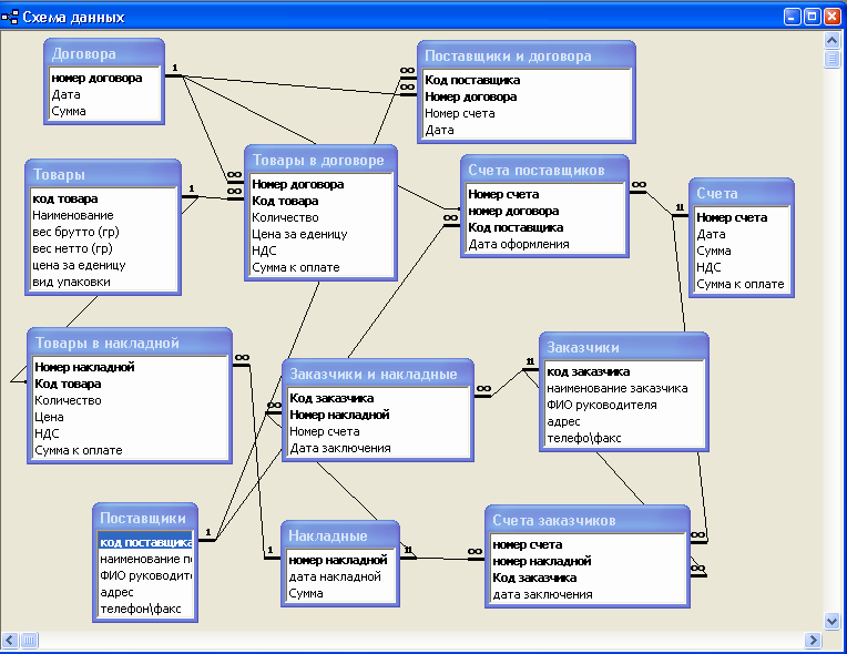 После создания таблиц, связываем их в единую схему данных используя средства Access 2000 в соответствие с описанием связей, см.п.1.6 и см.п.2.3. Полученная схема данных представлена на рис.5.2