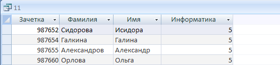 Запрос №11. Используя связанные таблицы Студенты и Сессия, создать запрос по которому из базы данных будут отобраны фамилии, имена, номера зачеток студентов, получивших оценку «отлично» (5) по информатике.