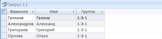 Запрос №1. Используя таблицу Студенты, создать три запроса, по которым из базы данных будут поочередно отобраны фамилии и имена студентов групп 1-Э-1, 1-Э-2, 1-3-3.