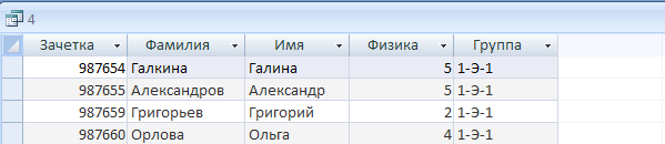 Запрос №4. Используя связанные таблицы, Студенты и Сессия, создать запрос, по которому из базы данных будут отобраны фамилии, имена, номера зачеток и оценки по физике студентов группы 1-Э-1.