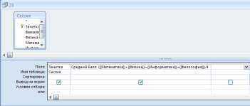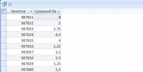 Запрос № 23. Используя, таблицу Сессия, создать запрос с именем Средний балл для расчета среднего балла каждого студента по результатам сдачи четырех экзаменов. Запрос обязательно должен содержать поле Зачетка, которое впоследствии будет использовано для связывания нескольких таблиц.