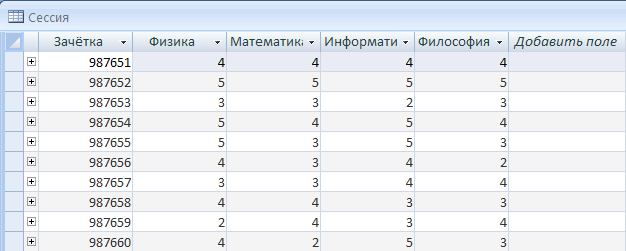 Запрос № 21. Используя связанные таблицы, Студенты и Сессия, создать запрос, по которому из базы данных будут отобраны фамилии, имена, номера зачеток студентов, получивших отличные (5) оценки по всем предметам.