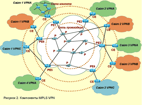 В магистральной сети провайдера только пограничные маршрутизаторы PE должны быть сконфигурированы для поддержки виртуальных частных сетей, поэтому только они «знают» о существующих VPN. Если рассматривать сеть с позиций VPN, то маршрутизаторы провайдера P непосредственно не взаимодействуют с маршрутизаторами заказчика CE, а просто располагаются вдоль туннеля между входным и выходным маршрутизаторами PE.