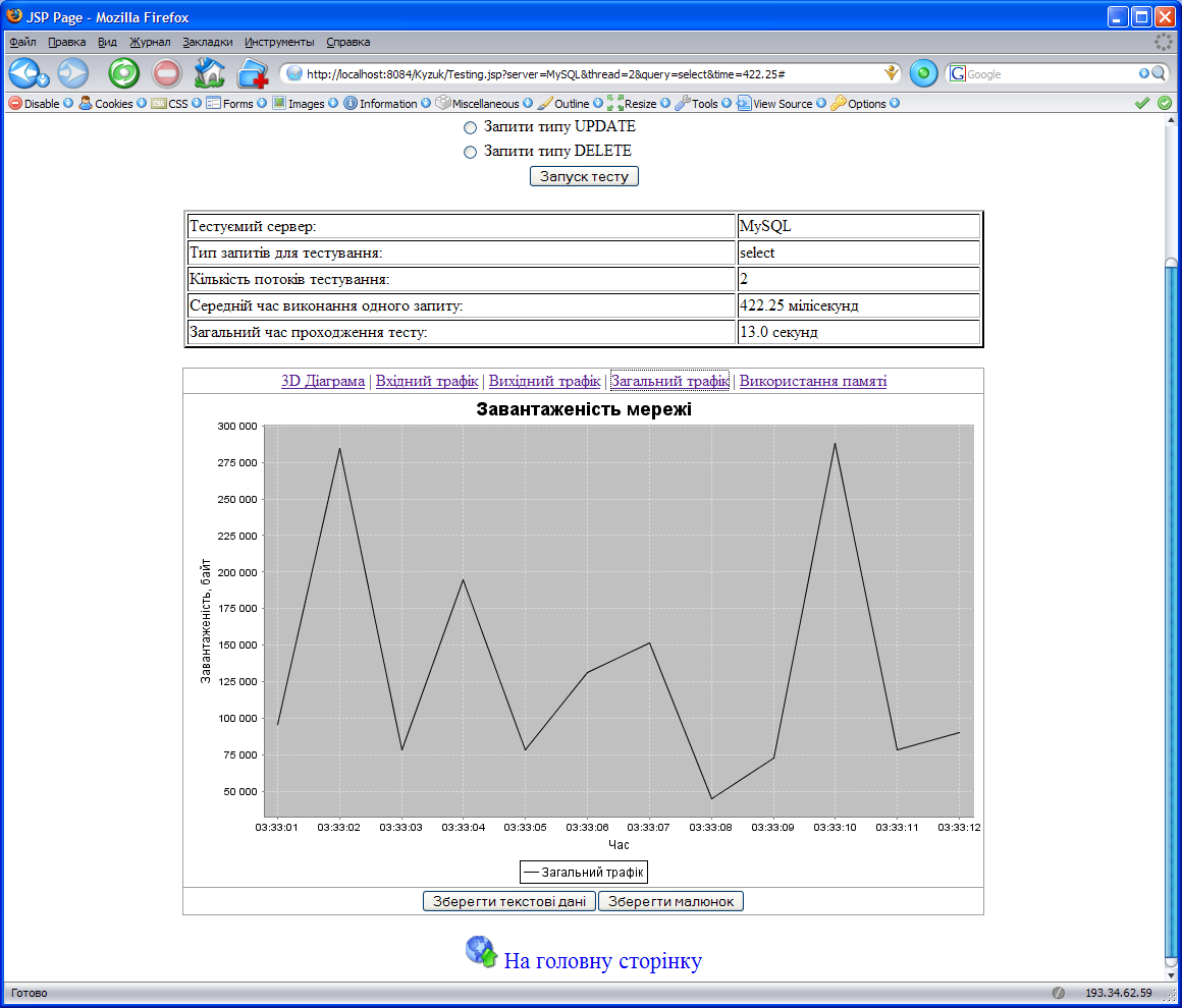 Для відображення завантаженості мережі, необхідно було розробити механізм отримання даних про проходження пакетів даних через мережну картку комп’ютера, на якому розміщувався WEB-сервер. В нашому випадку система тестування SQL-серверів була розроблена з використанням технологій сервлетів та JSP-сторінок мови Java.