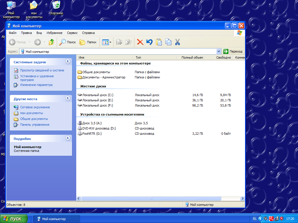 „Мой компьютер” – вызывает папку „Мой компьютер”, в которой находятся значки всех его локальных ресурсов: жестких, гибких и компакт-дисков, принтера и др.