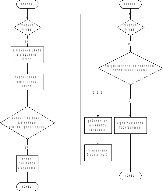Моя программа начинается с заставки. На экране появляется приветствующая надпись и кнопка входа в игру. После нажатия данной кнопки текущая форма приветствия делается невидимой, открывается форма самой игры. На этой форме находятся три кнопки и поле для ввода буквы. Кнопка для выхода из игры, для старта игры, кнопка для ввода введённой буквы в текстовое поле.