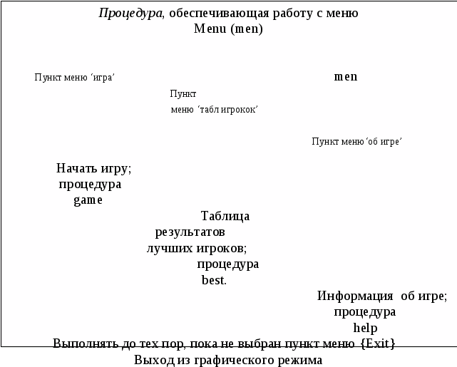 В первую очередь она обеспечивает интерфейс меню программы <15> и работу с ним пользователя. На экране игрок наблюдает меню, состоящее из 4-x пунктов. Выбор того или иного пункта осуществляется с помощью стандартных клавиш (up,down), что не сомненно очень удобно для любого пользователя, работающего с данной программой. Перемещение по пунктам меню осуществляется посредством цикла с постусловием. В теле цикла располагается несколько операторов условного перехода. В зависимости от того, какая клавиша нажата(up или down), переменной присваивается некоторое значение. После этого координаты указателя изменяются, и он становится на соответствующий пункт (в качестве указателя выступает закрашенный прямоугольник, цвет которого отличается от цвета пунктов меню). Далее проверяется условие выхода из цикла. Если нажата клавиша Enter, то осуществляется выход из цикла, иначе пользователь выбирает другой пункт меню. Таким образом, перемещение по пунктам меню происходит до тех пор, пока не нажата клавиша ввода.