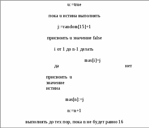 последующий элемент равен одному из предыдущих, то он задается еще раз. Данная операция осуществляется в цикле с предусловием, который выполняется пока некоторая логическая переменная имеет значение истина. Значение фальш переменная принимает в том случае, если значения предыдущих элементов массива не совпадают со следующим.