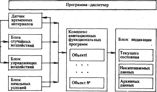 Комплекс имитационных функциональных программ по каждому моделируемому объекту определяет условное распределение вероятностей состояний объекта к окончанию каждого момента ДЛ При случайном выборе одного из возможных состояний это осуществляется функциональной подпрограммой; при выборе экспериментатором – программой, заложенной в блоке управляющих воздействий, или, при желании осуществлять этот выбор вручную на каждом такте, вводом новых начальных условий исходя из текущего состояния, определяемого с помощью блока индикации.