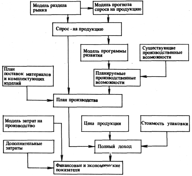 Для построения модели используется укрупненная СИВС. Методом единичной нити выявляют те функции и задачи, в результате которых может быть получен искомый результат в соответствии с назначением модели. На основании логико-функционального анализа строят структурную схему модели. Построение структурной схемы позволяет выделить ряд самостоятельных моделей, входящих в виде составных частей в модель предприятия. На рис. 3 приведен пример построения структурной схемы моделирования финансово-экономических показателей предприятия. Модель учитывает как внешние факторы – спрос на продукцию, план поставок, так и внутренние – затраты на производство, существующие и планируемые производственные возможности.