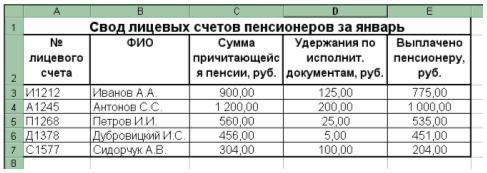 Рис. 22.1. Табличные данные документа «Свод лицевых счетов пенсионеров» за январь 2006 г.