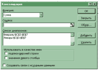 4.Ввести в поле Ссылка исходную область консолидируемых данных (Январь!$С$3:$E$7).