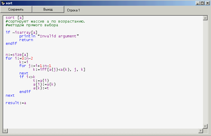Каждая строка, вводимая с консоли, содержит одну команду или ни одной (пустая строка или комментарий) команды. То же касается и строк файла функции, кроме первой, которая должна содержать описание функции в виде: <имя_функции>[<список_параметров>], где список параметров, заключаемый в квадратные скобки, состоит из имен параметров, разделенных запятой (эта строка также может содержать и комментарий после описания функции). Квадратные скобки пишутся даже при пустом списке параметров. Имена параметров (формальных) подчиняются тем же ограничениям, что и имена переменных, мало того, они рассматриваются как переменные, определенные в данной функции, но в начале выполнения функции они принимают значения соответствующих фактических параметров. Нужно отметить, что попытка передачи в качестве фактического параметра функции переменной с неопределенным значением всегда приводит к ошибке, даже если в функции к этому параметру нет ни одного обращения.. Также приводит к ошибке вызов функции с числом фактических параметров, не соответствующим числу формальных параметров. Кроме того, в каждой функции имеется переменная с предопределенным именем result. Ее значение на момент выхода из функции и является возвращаемым значением функции. В момент начала выполнения функции ее значение равно 0 (целое число). Если переменная result была удалена командой clear и осталась неопределенной на момент выхода из функции, возникает ошибка.
