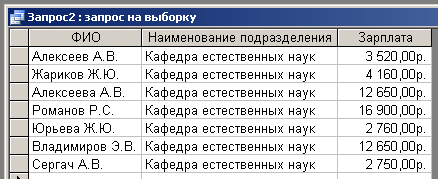 Рисунок 15. Конструктор запроса на выборку сотрудников кафедры естественных наук с расчетом надбавок