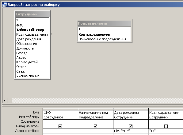 Для этого используем поля «Ф.И.О.» и «Год рождения» из таблицы Сотрудники и поле «Наименование подразделения» из таблицы Подразделения. В строку «Условия отбора» введем значение: LIKE «*12*». Знак * заменяет значения числа в месяце и года рождения. Для выбора подразделения «Кафедра иностранных языков» включим в запрос поле «Код подразделения» и для него в поле «Условие отбора» – код 14, соответствующий данной кафедре, и удалим флажок Вывод на экран.