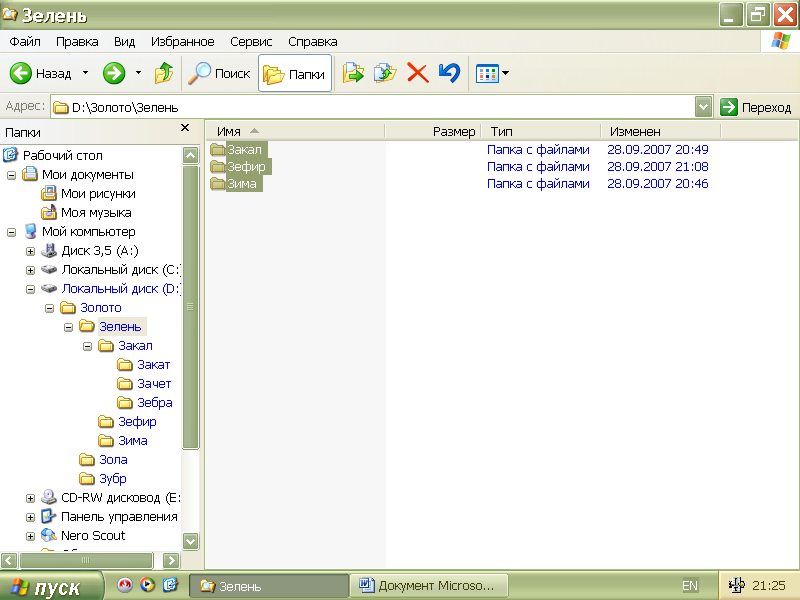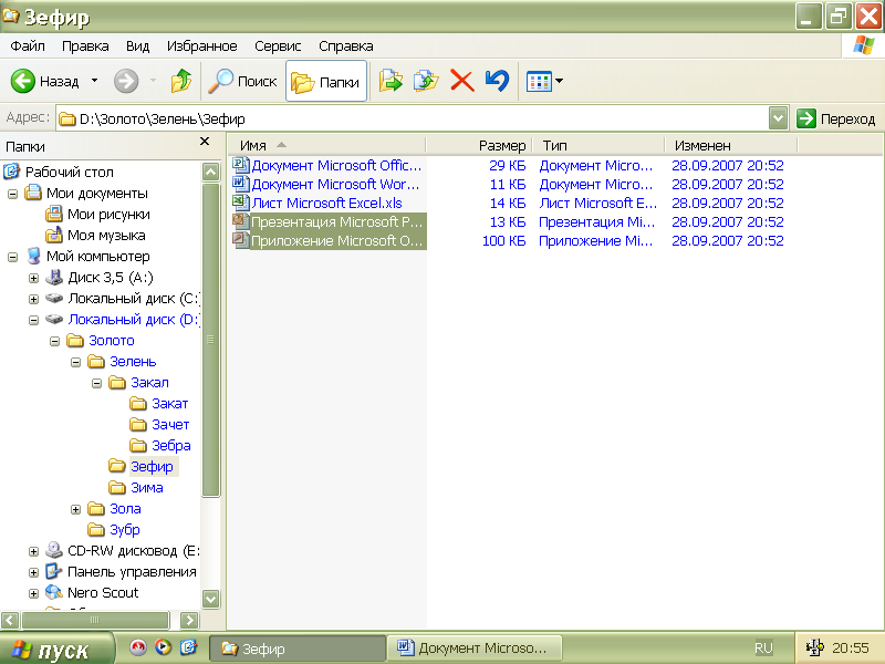 В каталоге третьего уровня «Зефир» создадим 5 произвольных файлов: