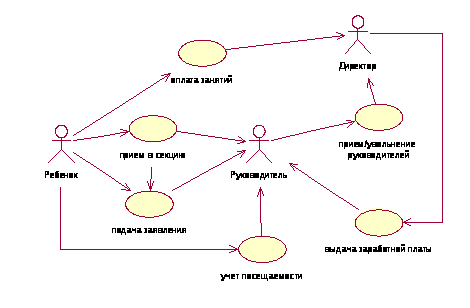 Ниже в таблицах 1.1 – 1.3, 2.1 – 2.3, 3.1 – 3.2, 4.1 – 4.2, 5.1 – 5.3, 6.1 – 6.2 приведено описание всех вариантов использования системы представленных на рисунке 1: подача заявления, прием в секцию, оплата занятий, выдача заработной платы, прием/увольнение руководителей, учет посещаемости.