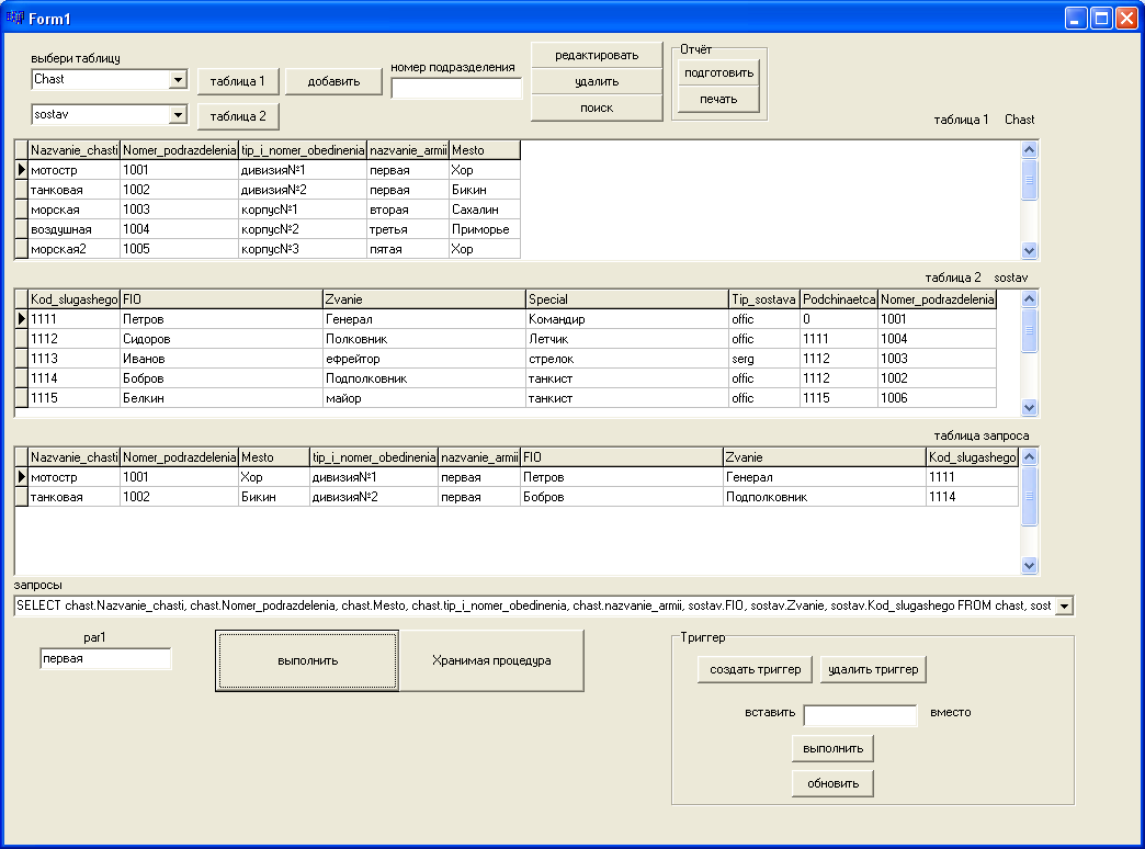 Получить перечень военнослужащих указанной специальности в округе, в отдельной армии, дивизии, корпусе, военной части, в указанном подразделении некоторой военной части.
