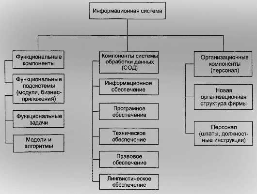 ИС независимо от сферы их применения, как правило, включают один и тот же набор компонентов: функциональные компоненты; компоненты системы обработки данных; организационные компоненты (рис. 1.).