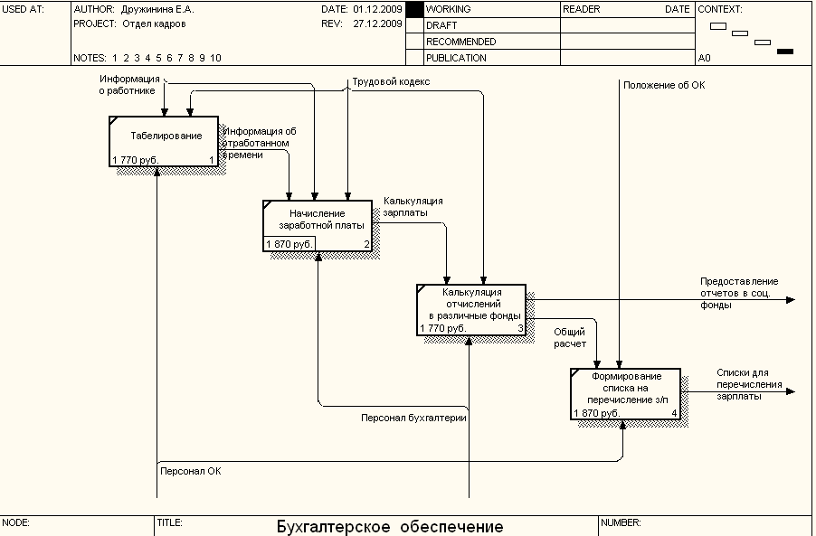 Модель представляет систему в виде контекстной диаграммы – одной работы «Деятельность отдела кадров» и дуг, изображающих интерфейсы с функциями вне системы. Эта работа декомпозируется на последующих диаграммах: «Прием и увольнение сотрудников», «Оценка персонала», «Делопроизводство по кадровым вопросам», «Бухгалтерское обеспечение».