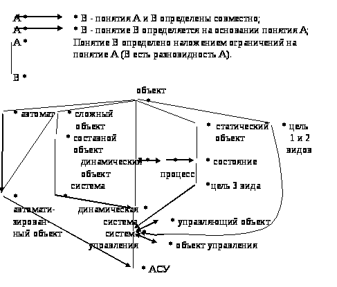 Очевидно, что введенное определение основывается на рассмотренных ранее понятиях системы управления, ее управляющего объекта и на понятии автоматизированного объекта. Если проанализировать взаимосвязь всех понятий, использованных при выводе определения АСУ, то можно построить схему, представленную ниже. На схеме знаком (*) изображаются различные понятия, а их взаимосвязи означают: