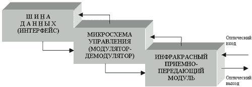 Канал передачи данных состоит из двух основных элементов: микросхемы, обеспечивающей модуляцию и демодуляцию поступающего двоичного сигнала согласно определенного алгоритма, и инфракрасного (ИК-) приемно-передающего модуля.