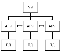 Если в машине I увеличить число пар арифметико-логическое устройство <=> память данных (иногда эту пару называют процессорным элементом) то получим машину IV (рис. 1.8). Единственное устройство управления выдает команду за командой сразу всем процессорным элементам. С одной стороны, отсутствие соединений между процессорными элементами делает дальнейшее наращивание их числа относительно простым, но с другой, сильно ограничивает применимость машин этого класса. Такую структуру имеет вычислительная система PEPE, объединяющая 288 процессорных элементов.