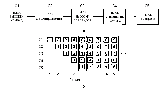 Стадия 3 выпускает команды значительно быстрее, чем стадия 4 способна их выполнять. Если бы стадия 3 выпускала команду каждые 10 не, а все функциональные блоки выполняли бы свою работу также за 10 не, то на четвертой стадии всегда функционировал бы только один блок, что сделало бы саму идею конвейера бессмысленной. В действительности большинству функциональных блоков четвертой стадии для выполнения команды требуется значительно больше времени, чем занимает один цикл (это блоки доступа к памяти и блок выполнения операций с плавающей точкой). Как видно из рис. 2 5, на четвертой стадии может быть несколько АЛУ.