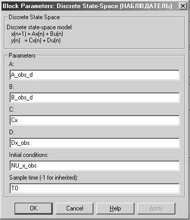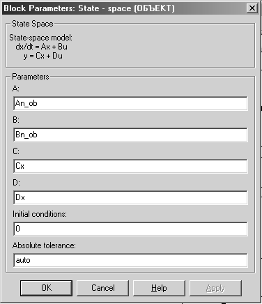 %Для того, чтобы провести моделирование, необходимо иметь доступ к вектору состояния объекта. Поэтому в файле SSLOpt_dSim.mdl при задании объекта в векторноматричной форме (блок State-Space) нужно вместо матрицы Cn_ob указать единичную