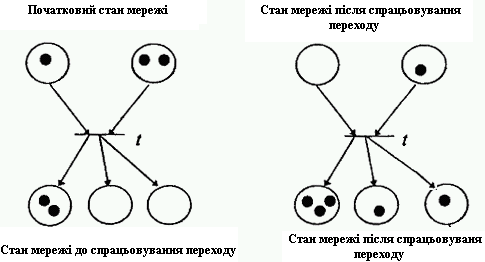Перехід може спрацювати, якщо є хоча б одна фішка у всіх його вхідних місцях (рис.1.3)