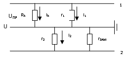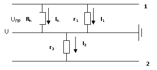 Человек прикоснулся к проводу 1 в аварийном режиме (рис.3,4). Определить UПР и ток через тело человека при r1 = 40кОм и r2 = 100кОм, rЗАМ=25Ом, Rh = 1000Ом, U=380В