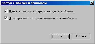 в открывшемся окне Сеть (рис.14) на вкладке Конфигурация проверить, какие устройства и протоколы установлены на данной рабочей станции. Если компьютер из сетевых устройств имеет только сетевую карту1, то вкладка должна содержать одну строку, соответствующую этому устройству, одну строку, соответствующую протоколу TCP/IP, и строку, соответствующую программе-клиенту для работы в сети Microsoft. Кроме того, здесь может содержаться строка: Служба доступа к файлам и принтерам сетей Microsoft. Если этой строки нет, то нажимают кнопку Доступ к файлам и принтерам и в открывшемся окне (рис.15), устанавливают флажки, отвечающие за то, чтобы файлы и принтеры данной рабочей станции были доступны другим компьютерам в сети;