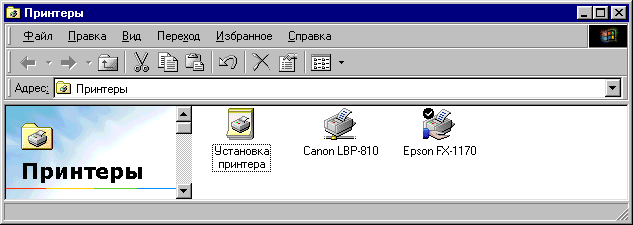 Сетевое имя принтера записывается по образцу рис. 27. Его также можно выбрать с помощью кнопки Обзор. На рис. 28 представлен вид окна Принтеры, в котором видно, что к компьютеру подключены два принтера: локальный Epson FX-1170 (используется по умолчанию и доступен к использованию в сети) и сетевой Canon LBP-810.